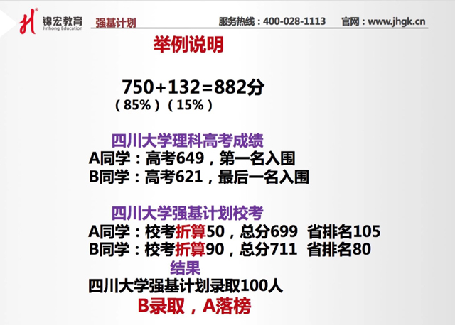 我们还是举例说明。强基计划分数总的构成:高考总分是750分,要不低于85%,校考成绩是不高于15%来换算,所以两项综合总分是882分。假设A同学高考分数是649分,以第一名的名次入围了四川大学的校考。B同学高考分数是621分,以最后一名的排名入围了四川大学的校考。由于川大校考的主要方式是面试,A同学没有接受系统的面试培训,结果在川大校考面试中很紧张,不知道如何应对,表现不好,在总分132分的校考中,仅获得50分。
